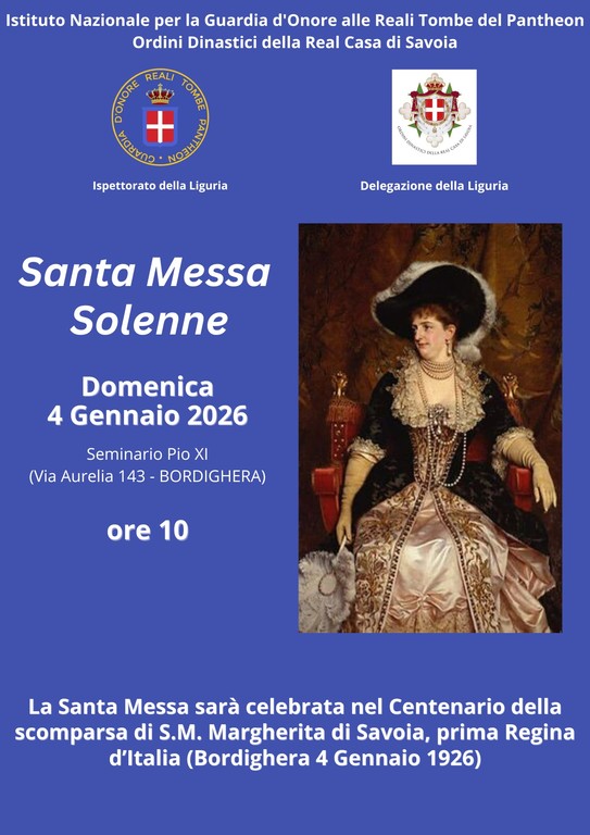 Una santa messa solenne è stata celebrata, in mattinata, nella cappella dell’ex seminario Pio XI di Bordighera in suffragio della defunta sovrana alla presenza del consigliere regionale Walter Sorriento, del sindaco di Caravonica Angelo Francesco Dulbecco, del maestro Andrea Verrando, organista titolare della cattedrale di Ventimiglia, del presidente della Croce Rossa di Bordighera Vincenzo Palmero, del maestro Luca Anghinoni, direttore della banda Borghetto San Nicolò-Citta di Bordighera, degli ex consiglieri comunali di Bordighera Marzia Baldassarre e Barbara Bonavia che hanno supportato gli organizzatori nella realizzazione dell'iniziativa, di Patrizia Bottiglieri, dama ai meriti dei Savoia e volontaria della Croce Verde Intemelia, di autorità militari, delle guardie d'onore liguri e piemontesi e di varie associazioni, come Gli Amici del Montenero, la compagnia balestrieri della città di Ventimiglia, il sestiere Burgu, il Comitato Pro Centro Storico di Ventimiglia, gli sbandieratori e musici della città di Ventimiglia, la Cumpagnia d'i Ventemigliusi e la Protezione civile di Dolceacqua. L’evento commemorativo e di raccoglimento è stato organizzato dall’Ispettorato della Liguria dell’Istituto Nazionale per la Guardia d’Onore alle Reali Tombe del Pantheon e dalla delegazione della Liguria degli Ordini Dinastici della Real Casa di Savoia. L’iniziativa odierna ha dato il via alle cerimonie ufficiali organizzate su tutto il territorio nazionale nel 2026 dall’Istituto Nazionale per la Guardia d’Onore alle Reali Tombe del Pantheon che per mandato sorveglia la tomba di S.M. la Regina Margherita insieme a quelle degli altri sovrani italiani.