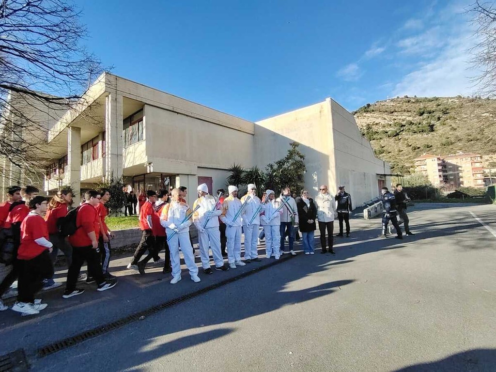 Particolarmente significativo è stato il passaggio dal Liceo Aprosio, storica e poliedrica istituzione scolastica della città. La scuola, da sempre punto di riferimento culturale e formativo per il territorio, ha voluto rendere omaggio all’evento con una calorosa accoglienza, coinvolgendo studenti, docenti e personale scolastico. Il cortile e gli spazi antistanti l’istituto si sono animati di colori, bandiere e applausi, in un clima di partecipazione autentica e sentita.