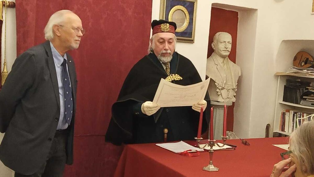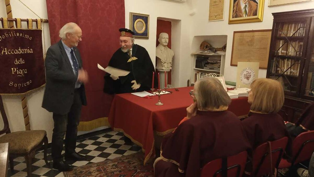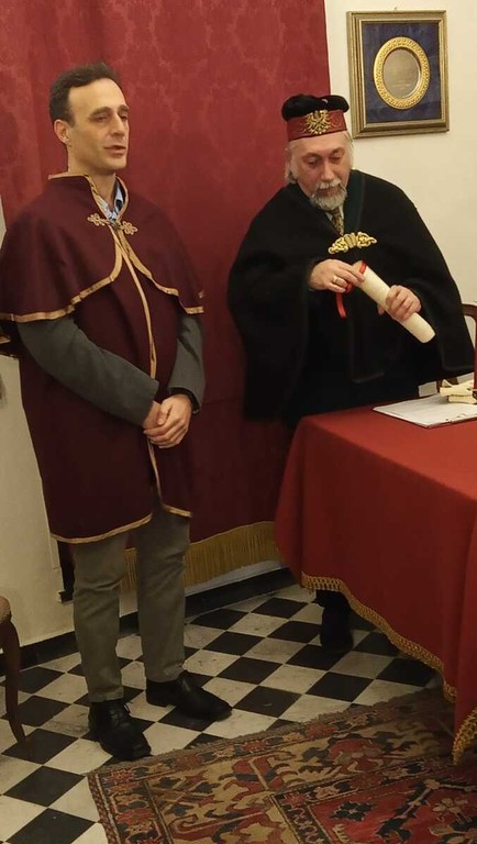 Tra i momenti più sentiti dell’assemblea, il ricordo del confratello Alfredo Moreschi, recentemente scomparso, che per diciassette anni è stato tra i membri più attivi del Sodalizio, contribuendo in modo significativo alla tutela e alla valorizzazione della memoria storica locale. Cuore dell'assise è stata l’ammissione di due nuovi Accademici. Il dottor Luca Tosin, funzionario dell’Archivio di Stato di Imperia, è stato accolto con la qualifica di “Accademico per l’Archivistica”, dicastero già ricoperto dalla compianta Accademica Maristella La Rosa. Accanto a lui, il documentarista Roberto Pecchinino ha ricevuto la nomina di “Accademico per l’Archivistica audiovisiva”. La cerimonia, breve ma carica di significato, si è svolta secondo tradizione con la consegna del diploma e la vestizione con la clamide color cremisi, ceduta dai due Accademici più anziani presenti.