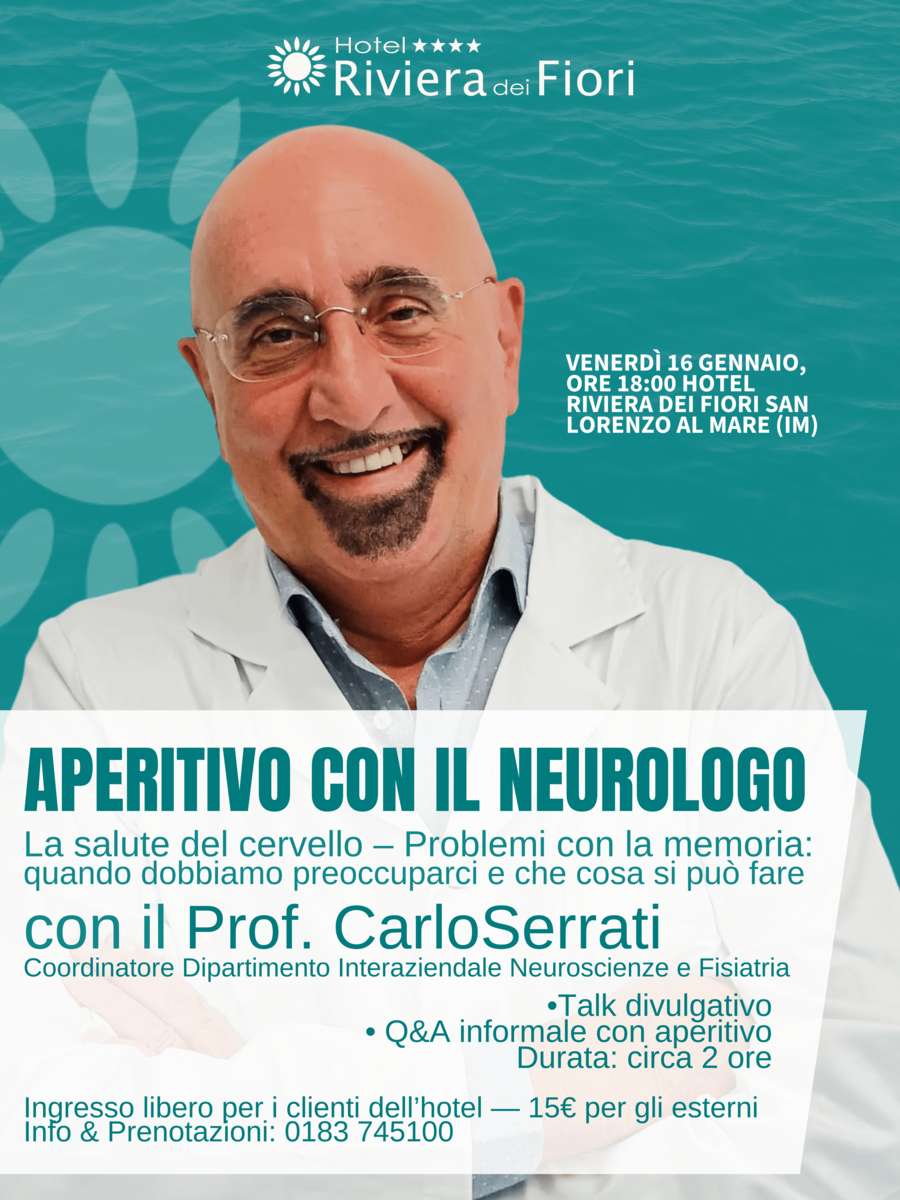 Dopo il grande successo e l’ampio apprezzamento di pubblico registrati in occasione del primo appuntamento tenutosi a ottobre 2025, torna all’Hotel Riviera dei Fiori di San Lorenzo al Mare l’iniziativa “Aperitivo con il Neurologo”, l’originale format che unisce divulgazione scientifica di alto livello e un’atmosfera conviviale e rilassata.Il prossimo incontro si terrà venerdì 16 gennaio, a partire dalle ore 18, e sarà nuovamente curato dal dottor Carlo Serrati, neurologo di riconosciuta autorevolezza, coordinatore del Dipartimento Interaziendale di Neuroscienze della Liguria, direttore scientifico del progetto PREVE.D.I. – Prevenzione Demenze e Ictus e docente di Neurologia Clinica presso l’Università di Genova.