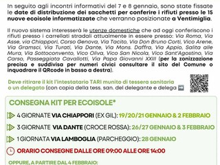 Gli orari di consegna saranno dalle 9 alle 14. A partire dal 4 febbraio, chi non avesse ancora ritirato il kit potrà farlo presso il Green Point di Ventimiglia, situato in Piazza Ettore e Marco Bassi 1 (sotto la Biblioteca civica), aperto il martedì, mercoledì e sabato dalle 9 alle 13.