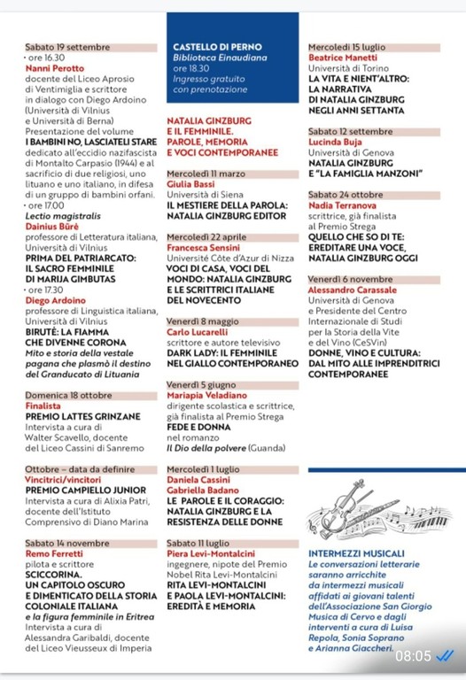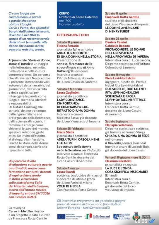 Filo conduttore è il femminile, tra storie di donne e storie di parole per un percorso che attraversa mito, Novecento e contemporaneità, mettendo al centro le voci delle donne, il loro pensiero, la loro scrittura, la loro capacità di interrogare il presente. Gli incontri si alterneranno tra l'oratorio di Santa Caterina di Cervo e il Castello di Perno, luogo simbolo della cultura novecentesca italiana, di proprietà di Gregorio Gitti. Due spazi che diventano luoghi di ascolto e dialogo, in un calendario che da gennaio a novembre 2026 porterà in scena alcune tra le più autorevoli voci della cultura italiana.