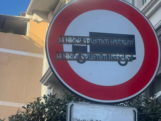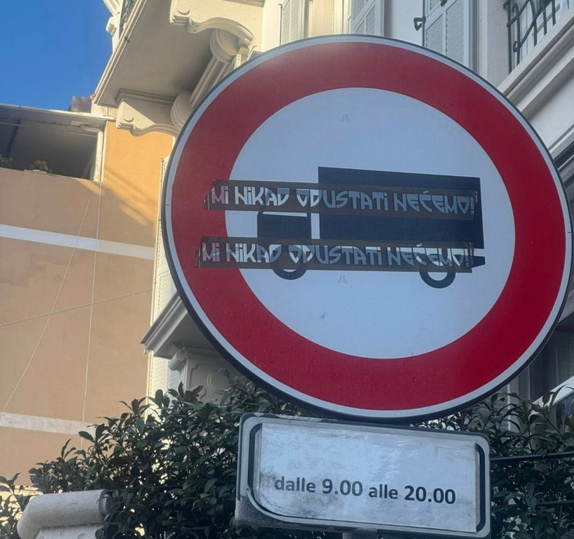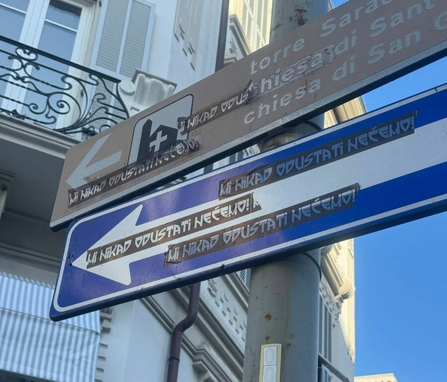 Gli adesivi riportano la frase “mi nikad odustati nećemo”, espressione in lingua slava – diffusa tra croato, serbo e bosniaco – che può essere tradotta come “noi non ci arrenderemo mai” o “non rinunceremo mai”.