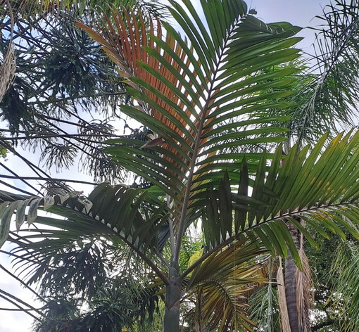 In questi giorni, in pieno gennaio, passeggiando tra i viali del parco possiamo osservare una vera e propria chicca botanica: Chambeyronia macrocarpa (Brongn.) Vieill. ex Becc. (1920), meglio conosciuta come flame thrower palm o “palma dalla foglia rossa”. Si tratta di una palma endemica della Nuova Caledonia, che non passa certo inosservata per la sua inconsueta giovane foglia carminio. La specie è originaria delle foreste calde e umide dell’isola del Mar dei Coralli, nel Pacifico meridionale, dove vive all’ombra dei grandi alberi tropicali.