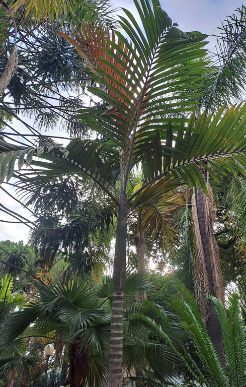 A Sanremo è giunta in occasione della II edizione della prestigiosa Biennale delle Palme Dies Palmarum, donata al giardino dallo scrittore e botanico francese Daniel Jacquemin. La giovane piantina, dopo un viaggio dall'altro capo del mondo di oltre 20.000 km, era giunta con un gruppo di sorelle a Hyères e da lì Daniel l’aveva portata a Sanremo. Da quei giorni sono passati quasi 25 anni e la palma è cresciuta, anche se lentamente, in tutta la sua bellezza. Ha un portamento armonioso ed elegante: il tronco è eretto ed esile, cilindrico, piacevolmente liscio al tatto, di colore verde scuro e contraddistinto in modo regolare dagli anelli lasciati ogni anno dall’attaccatura delle foglie cadute. Un calendario vivente che racconta tutta l’attività vegetativa, le foglie prodotte e le meravigliose fioriture emesse. Le sue foglie sono pennate, composte da foglioline piuttosto larghe e carnose, di un bel colore verde intenso, che assumono un piacevole tono rosso, arancio o bronzo nei primi giorni dopo l’apertura. La base fogliare avvolge completamente il fusto per circa un metro, formando un elegante capitello.
