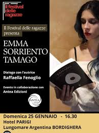 Emma Sorriento ospite al Festival delle Ragazze. La giovane scrittrice presenterà il suo ultimo libro, Tamago, domenica 25 gennaio alle 16.30 presso l’hotel Parigi sul lungomare Argentina a Bordighera. L'incontro è organizzato dall’associazione culturale Il Festival delle Ragazze che è lieta di ospitare la presentazione del romanzo, edito da Antea Edizioni, dell’autrice ligure emergente. Dialogherà con l’autrice Raffaella Fenoglio.