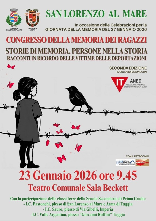Martedì 23 gennaio – Ore 9.45 – Teatro Comunale Sala Beckett Si svolge il Congresso della Memoria dei Ragazzi, un appuntamento dedicato agli studenti per riflettere sulla Shoah e sulla storia del Novecento. Organizzato da Comune di San Lorenzo al Mare, Provincia di Imperia, Aned, ISRECIm e USR Liguria.