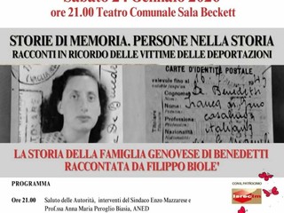 Sabato 24 gennaio – Ore 21 – Teatro Comunale Sala Beckett Serata “Storie di Memoria, Persone nella Storia” con Filippo Biole’, che racconterà la storia della famiglia genovese Benedetti. Evento promosso dagli stessi enti del Congresso della Memoria.