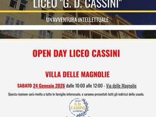 Il Liceo G.D.Cassini di Sanremo, dopo i “venerdì del Cassini” in cui ogni indirizzo di studi si è proposto al pubblico di studenti e genitori nella sua specificità, aprirà le porte in seduta plenaria sabato 24 gennaio a villa Magnolie dalle ore 10.00 alle 12.00. Dopo l’accoglienza della Dirigente Mara Ferrero , docenti e studenti di ogni indirizzo presenteranno le proposte didattiche e culturali dei quattro indirizzi di studio all’interno della fisionomia formativa del liceo.