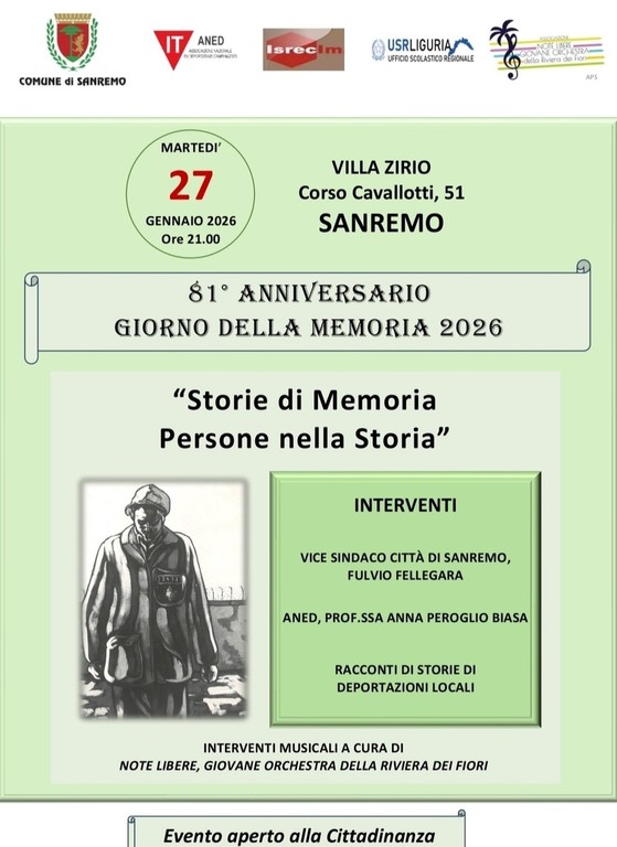 L’iniziativa è promossa dal Comune di Sanremo in collaborazione con ANED, ISREC IM, USRL Liguria e l’Associazione Note Libere APS.