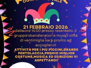 Una festa di Carnevale proposta dal gruppo Sbandieratori e Musici Città di Ventimiglia in collaborazione con il Comune. "Vi aspettiamo sabato 21 febbraio a partire dalle 14 al Resentello per passare una giornata insieme tra giochi e divertimento!" - dicono gli organizzatori.
