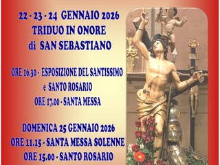 Oggi, il 23 gennaio, e domani, il 24 gennaio, alle 16.30 vi sarà, invece, l'esposizione del santissimo e il santo rosario con a seguire, alle 17, la celebrazione della santa messa in occasione del Triduo, iniziato ieri, in onore di San Sebastiano.