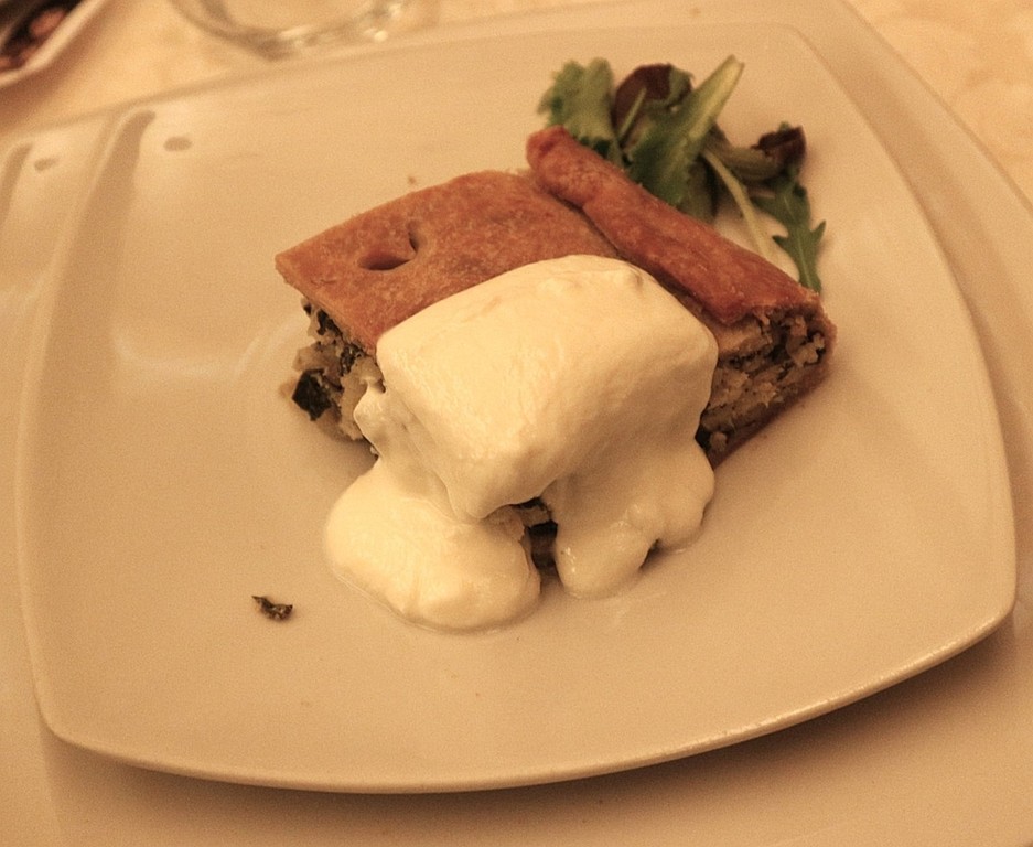 Il menù si è aperto con una torta di riso Carnaroli su crema di prescinsêua, rilettura di un classico ligure in cui il riso ha donato struttura e naturale cremosità, bilanciata dalla freschezza del latticino.