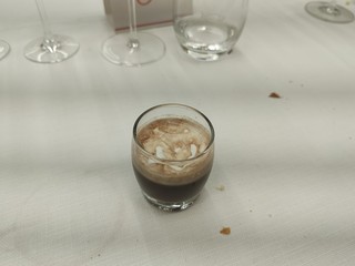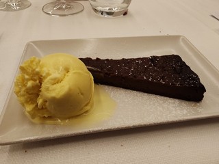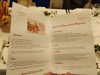 Dopo un tazzone di buon brodo caldo di carne, conciato e aromatizzato al vino Barbera d'Asti Riserva Cantina L.A. Soria di Calosso d'Asti, si è proseguito con Castel Ariund d'alpeggio erborinato da latte vaccino del caseificio valle Gesso di Entracque e l'introvabile mostarda Cognà di casa Sattanino alle mele cotogne e mosto di moscato ridotto. La cena si è conclusa con la “Torta di Nonna Gilda”, torta di mele dimenticata al forno quanto basta, con gelato alla vaniglia del Madagascar e il “Bicerin” di Camillo Benso Conte di Cavour, il caffè della consolata di Torino sin dal 1763, accompagnato dal “Dolcearoma” da uve Moscato, Calosso d'Asti cantina L.A. Soria, e una grappa di Moscato, di Barbera e alla Ruta della distilleria Beccaris.