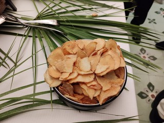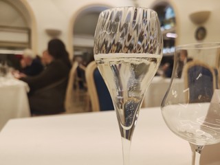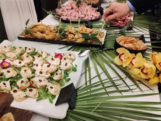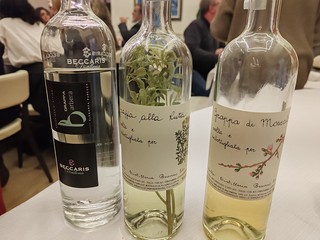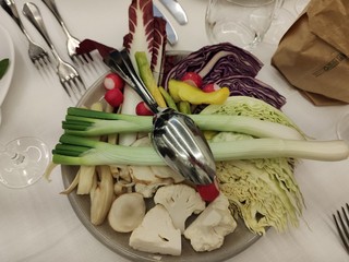 Si è iniziato da un aperitivo con la mortadella La Ghiotta Dop, frittelle di baccalà norvegese, foglie di salvia sclarea in pastella, focaccia alle nocciole tonde gentili di Cortemiglia, crostino di pane di Airole con gorgonzola al mascarpone del caseificio Palzola e chips di Ciapinabò di Carignano accompagnati da un “Punch” di Vermouth Torino Antica Formula del 1786 e da un Prosecco di Valdobbiadene Superiore DOCG extra dry dell'azienda Borgo Molino.