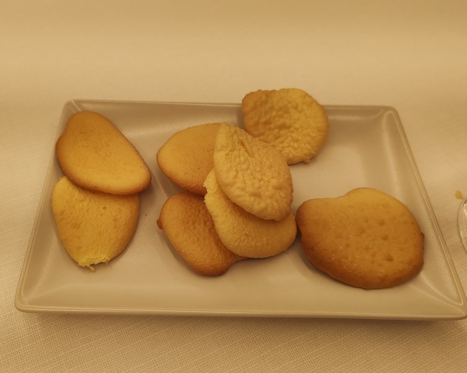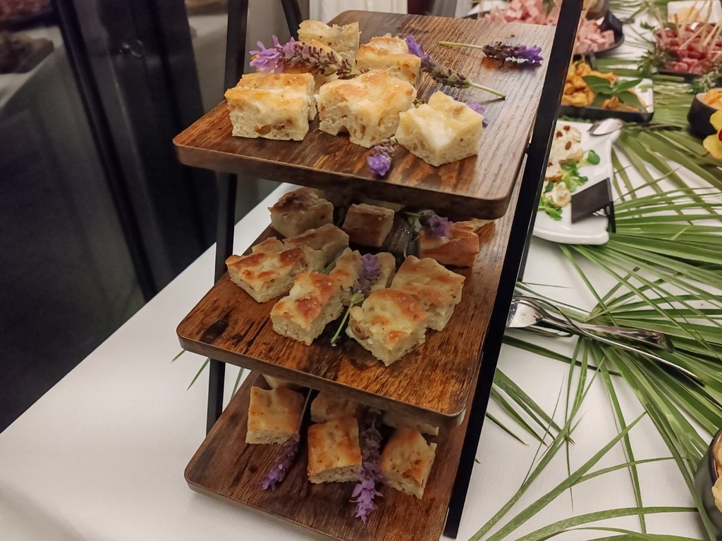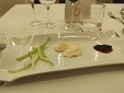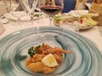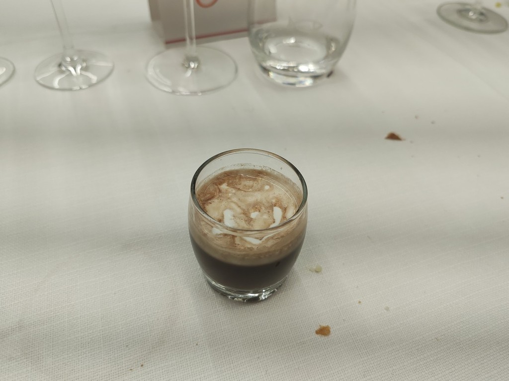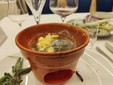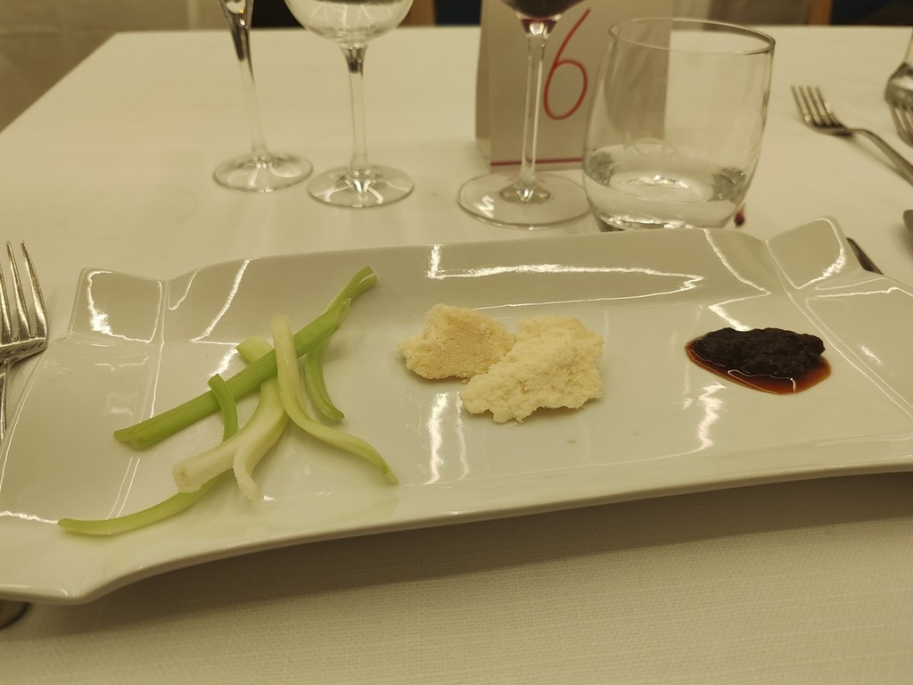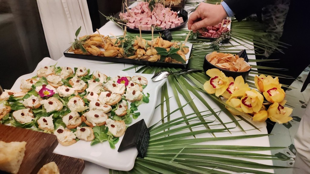 Si è iniziato da un aperitivo con la mortadella La Ghiotta Dop, frittelle di baccalà norvegese, foglie di salvia sclarea in pastella, focaccia alle nocciole tonde gentili di Cortemiglia, crostino di pane di Airole con gorgonzola al mascarpone del caseificio Palzola e chips di Ciapinabò di Carignano accompagnati da un “Punch” di Vermouth Torino Antica Formula del 1786 e da un Prosecco di Valdobbiadene Superiore DOCG extra dry dell'azienda Borgo Molino.