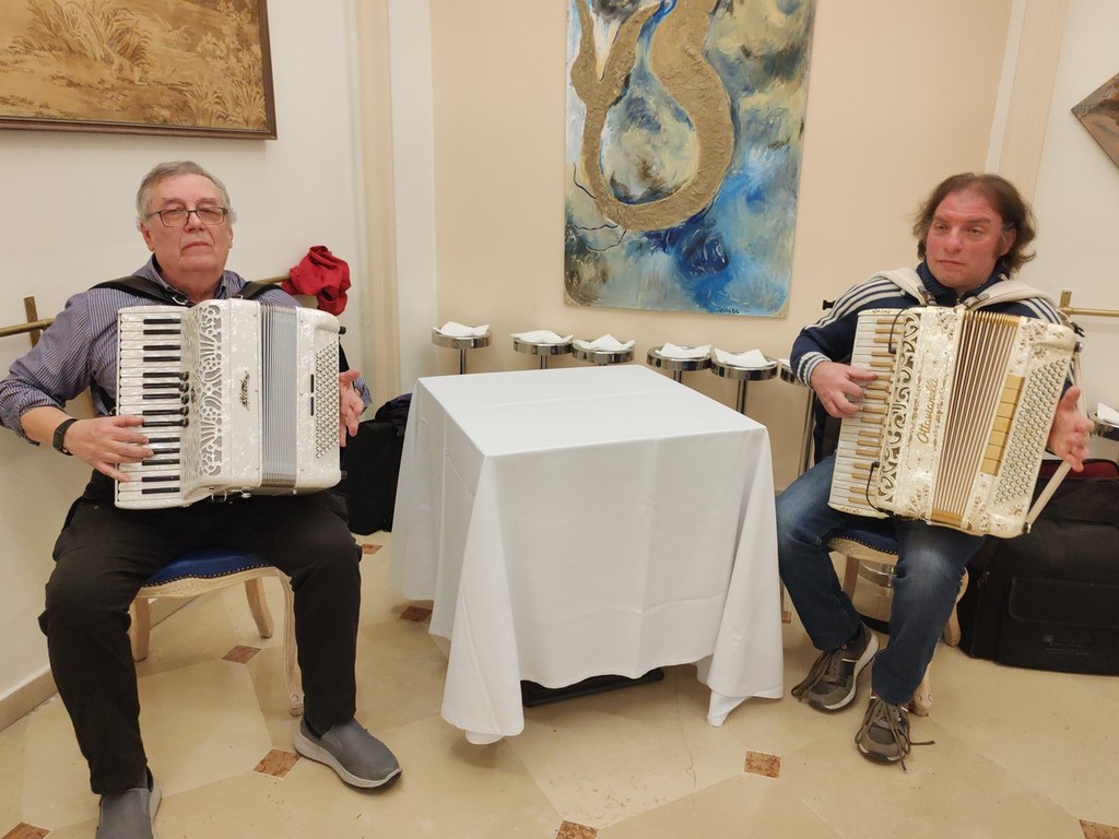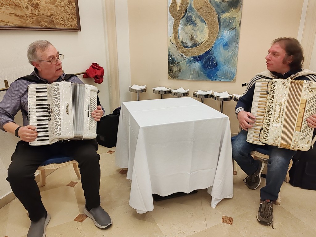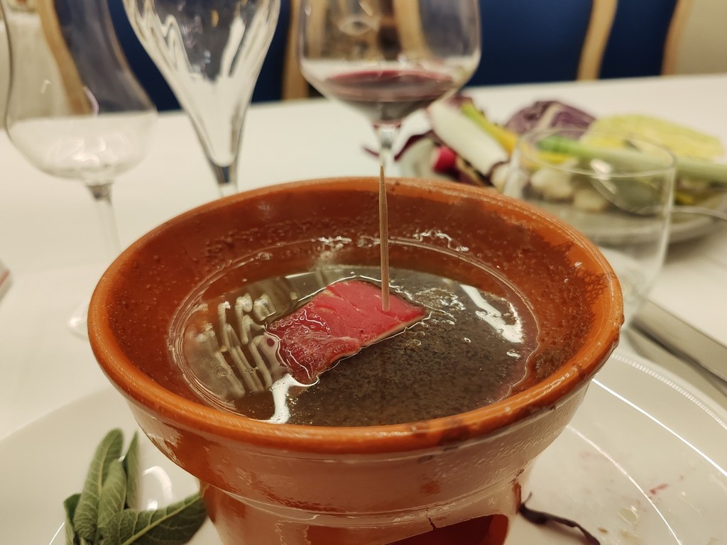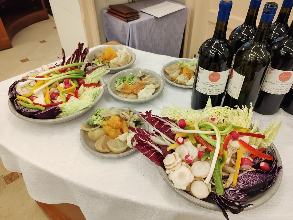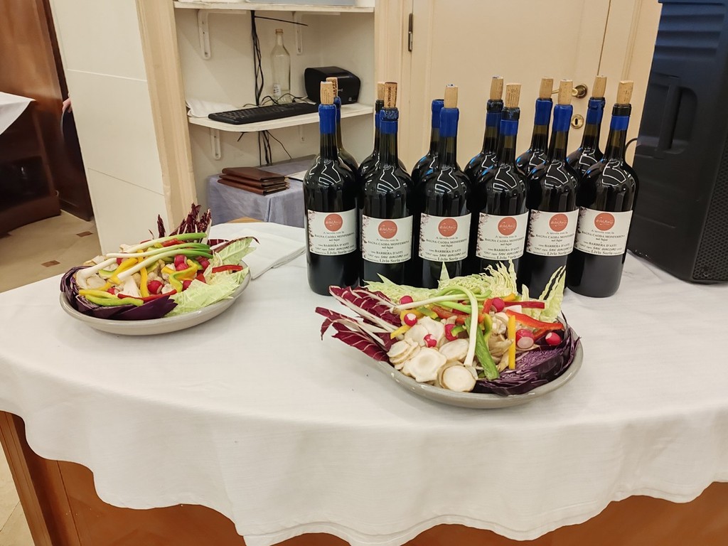 Sono stati poi serviti i Batsoà, "le calze di seta", insaporite e fritte ma la portata principale è stata la bagna caoda monferrina nel fujot, con i “ciapinabò” di Carignano, i cardi gobbi di Nizza Monferrato, i “Puvrun" di Carmagnola, Muja nelle vinacce di Barbera D'Asti con tutto il “carosello“ di verdure invernali dell'orto, cotte e crude. Si sono potuti provare anche mini involtini di Fassona con fontina Dop della valle d'Aosta e le uova del primo coccodè strapazzate nel fujot. Il tutto accompagnato con un Barbera di Calosso d’Asti 2025 en Primeur della vendemmia 2025, spillato direttamente dal fusto nella cantina L.A. Soria.