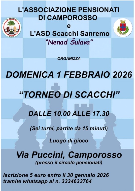L'evento è organizzato dall'associazione pensionati di Camporosso e dall'Asd Scacchi Sanremo 'Nenad Suava'. "L'iscrizione è di 5 euro" - fanno sapere gli organizzatori - "Ci si potrà iscrivere entro il 30 gennaio tramite Whatsapp al numero 3334633764".