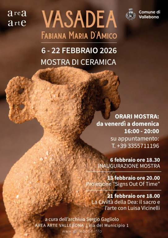 L'inaugurazione sarà il 6 febbraio alle 18.30 mentre il 13 febbraio alle 20 è prevista una proiezione: Signs Out Of Time. Il 21 febbraio, invece, alle 18 si terrà La civiltà della Dea: il sacro e l’arte con Luisa Vicinelli. Un’occasione per avvicinarsi a una ricerca artistica che intreccia gesto, terra e memoria.