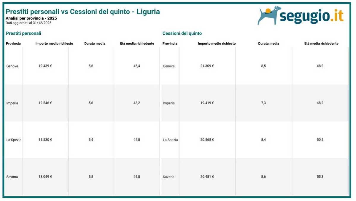 Per quanto riguarda le cessioni del quinto, anche nel 2025 i dipendenti privati rappresentano la quota principale delle richieste, confermando una tendenza ormai consolidata. In provincia di Imperia, però, si registra l’importo medio richiesto più basso della Liguria, pari a 19.419 euro, a fronte di una media regionale superiore ai 21 mila euro. Un dato che suggerisce una maggiore prudenza negli importi finanziati. Interessante anche il profilo anagrafico dei richiedenti di cessione del quinto: Imperia, insieme a Genova, presenta i richiedenti più giovani della regione, con un’età media di 48 anni e 3 mesi, ben al di sotto di province come Savona, dove si superano i 55 anni.
