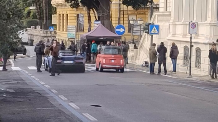 Corso Imperatrice interdetta al traffico e ai pedoni, questa mattina nel tratto compreso tra la zona del Casinò e largo Nuvoloni per la registrazione di uno spot pubblicitario. A finire davanti alle telecamere una Fiat Topolino, affiancata da una Lamborghini, sotto l’occhio attento della produzione e con l’ordine tassativo di non scattare fotografie.