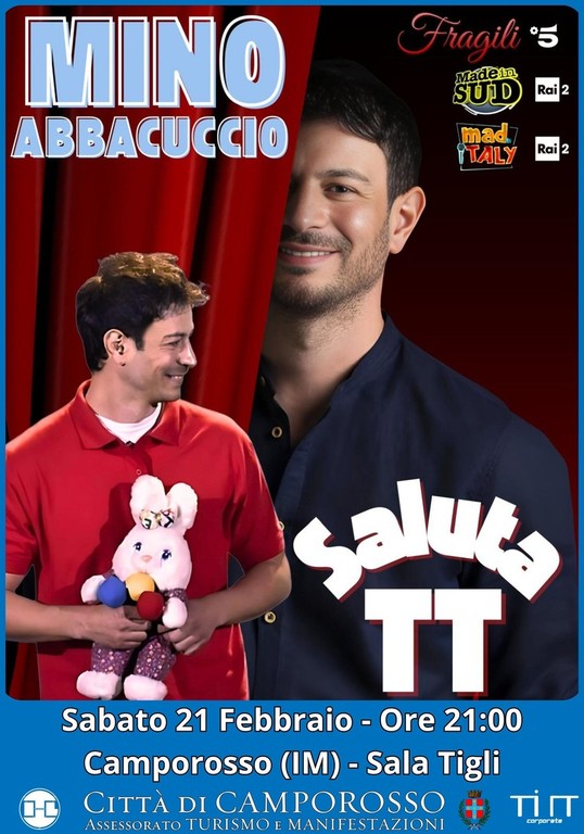 Spettacolo comico con Mino Abbacuccio a Camporosso. “Saluta TT” andrà in scena sabato 21 febbraio alle 21 presso la sala Tigli del Centro Polivalente G. Falcone.