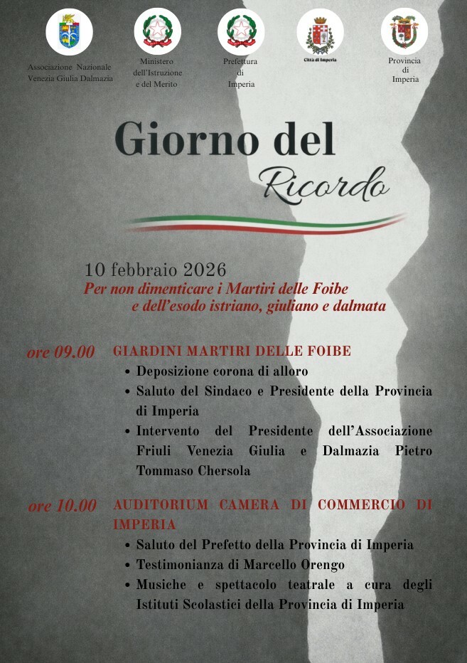Come di consueto, a Imperia si terrà una cerimonia commemorativa, articolata in due momenti, alla presenza delle Autorità civili, militari e religiose della provincia. In particolare, la commemorazione avrà luogo martedì 10 febbraio a partire dalle ore 9.00, presso i Giardini Martiri delle Foibe dove sarà deposta una corona d’alloro. Seguiranno gli interventi del Sindaco e Presidente della Provincia di Imperia e del Presidente dell’Associazione Venezia Giulia e Dalmazia. A seguire, alle ore 10.00, presso l’Auditorium della Camera di Commercio, si terrà un incontro con gli studenti, organizzato dalla Prefettura in collaborazione con il Comune, la Provincia, l’Ufficio Scolastico Provinciale e il Comitato provinciale ANVGD (Associazione Nazionale Venezia Giulia e Dalmazia).
