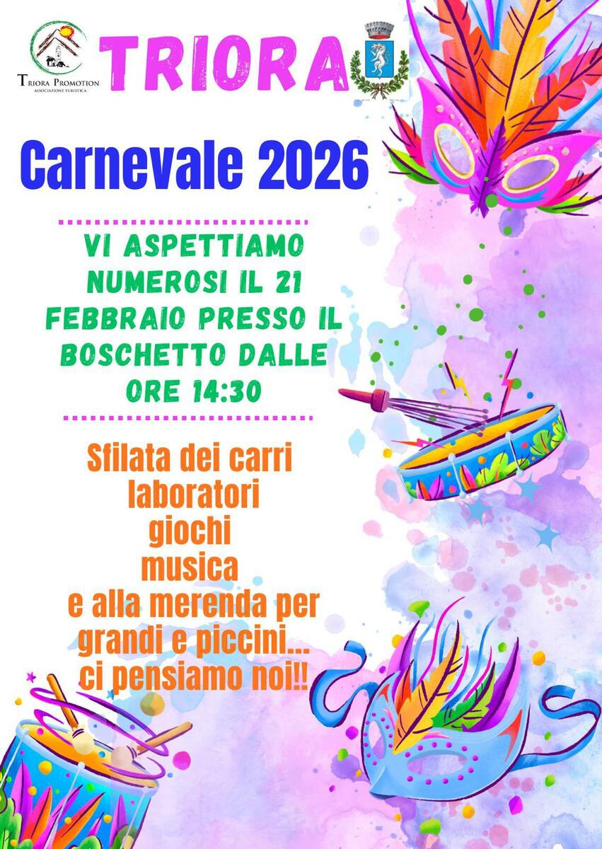 Sarà un pomeriggio all’insegna della festa, della semplicità e della creatività quello in programma venerdì 21 febbraio a Triora, quando il Carnevale 2026 animerà la località Boschetto a partire dalle ore 14.30. Un appuntamento pensato soprattutto per i più piccoli, ma capace di coinvolgere famiglie e visitatori di ogni età, con un programma ricco e informale, senza un tema prestabilito, per lasciare spazio alla fantasia.