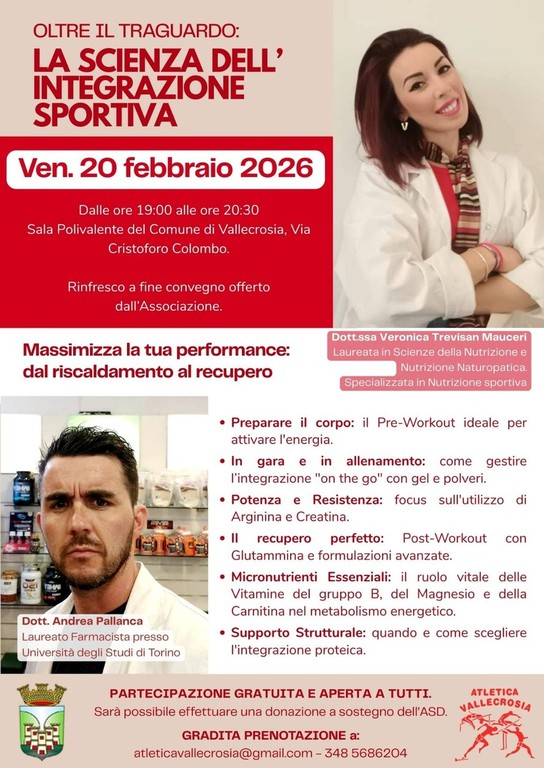Un'occasione unica per parlare insieme alla dottoressa Veronica Trevisan Mauceri, laureata in Scienze della Nutrizione e Nutrizione Naturopatica, specializzata in Nutrizione sportiva, e al dottor Andrea Pallanca, laureato farmacista presso l'università degli studi di Torino, di come si può massimizzare la propria performance dal riscaldamento al recupero. Si soffermeranno, perciò, su come preparare il corpo, il pre-workout ideale per attivare l'energia; come in gara e in allenamento gestire l'integrazione "on the go" con gel e polveri; di potenza e resistenza, un focus sull'utilizzo di Arginina e Creatina; sul recupero perfetto, post-workout con Glutammina e formulazioni avanzate; di micronutrienti essenziali, il ruolo vitale delle vitamine del gruppo B, del Magnesio e della Carnitina nel metabolismo energetico; e di supporto strutturale: quando e come scegliere l'integrazione proteica.