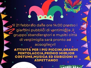 Una festa di Carnevale proposta dal gruppo Sbandieratori e Musici Città di Ventimiglia con il patrocinio del Comune. "Un appuntamento imperdibile per festeggiare il Carnevale tutti insieme, tra sorrisi, tradizione e divertimento, nel segno della comunità e della gioia di stare insieme" - dicono.