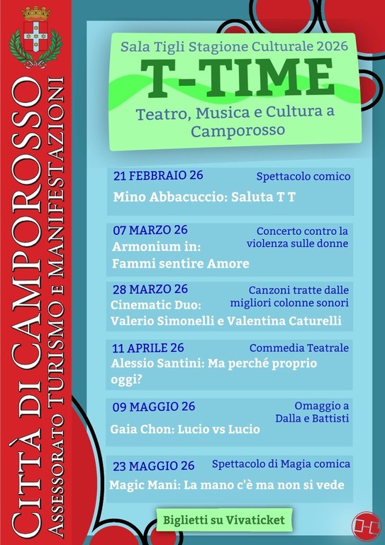 Teatro, comicità, musica dal vivo e intrattenimento al centro della stagione teatrale - musicale 2026 proposta dal comune di Camporosso: "T - Time".
