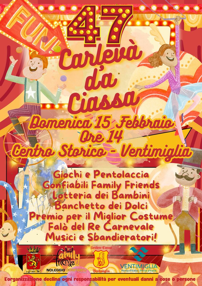 Domenica prossima dalle 14, Ventimiglia Alta si anima con il ritorno del tradizionale Carlevà d’a Ciassa, in programma nella suggestiva piazza della Cattedrale, nel cuore del centro storico. Giunto alla 47esima edizione, l’evento è organizzato dal Sestiere Ciassa con il patrocinio del Comune di Ventimiglia. Da quest’anno, il Carnevale si arricchisce inoltre della collaborazione di Family Friends Eventi, che porterà in piazza gonfiabili e coloratissime mascotte per la gioia dei più piccoli.
