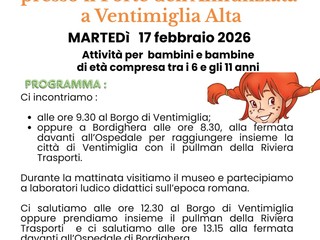 Le attività del mattino sono rivolte a bambini e bambine di età compresa tra i 6 e gli 11 anni. "Ci incontreremo alle 9.30 al borgo di Ventimiglia oppure alle 8.30 alla fermata dell'autobus davanti all'ospedale di Bordighera, da dove con il pullman della Riviera Trasporti raggiungeremo insieme la città di Ventimiglia" - fanno sapere gli organizzatori - "Durante la mattinata visiteremo il museo e parteciperemo a laboratori ludico didattici sull'epoca romana. Ci saluteremo alle 12.30 al borgo di Ventimiglia oppure prenderemo poi insieme il pullman della Riviera Trasporti e ci saluteremo alle 13.15 alla fermata davanti all'ospedale di Bordighera. Le attività si svolgeranno alla presenza del personale educativo della cooperativa Jobel e sono finanziate dal Programma Pippi. Per informazioni e prenotazioni entro il 14 febbraio contattare il 3932591582".