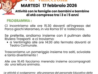 Le attività del pomeriggio, invece, sono rivolte alle famiglie con bambini e bambine di età compresa tra i 3 e i 5 anni. "Ci incontreremo alle 15.30 davanti all'ingresso del parco giochi Marameo, in via Roma 97, a Vallecrosia oppure possiamo ritrovandoci alle 14.30 alla fermata davanti al teatro comunale di Ventimiglia per andare insieme con il pullman della Riviera Trasporti" - dicono gli organizzatori - "Trascorreremo un pomeriggio insieme tra salti, scivolate e tanto divertimento. Alle 16.45 faremo merenda insieme accompagnati da una lettura animata. Le attività si svolgeranno alla presenza del personale educativo della cooperativa Jobel e sono finanziate dal Programma P.I.P.P.I. Per informazioni e prenotazioni entro il 14 febbraio contattare il 3445157897, solo tramite Whatsapp".
