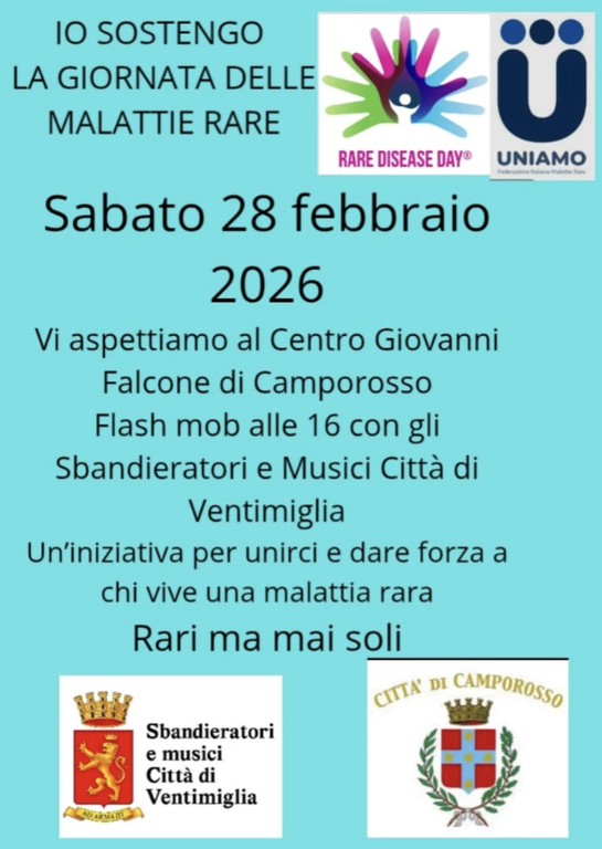 "Io sostengo la giornata delle malattie rare". Un flash mob con gli Sbandieratori e Musici Città di Ventimiglia verrà proposto sabato 28 febbraio alle 16 al centro Giovanni Falconi a Camporosso in occasione del Rare Disease Day 2026.