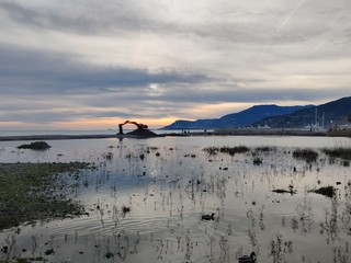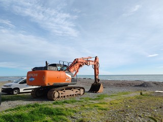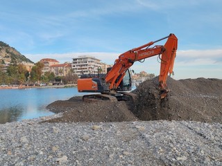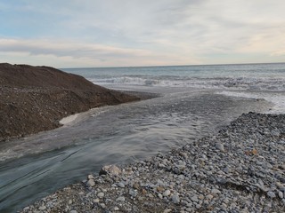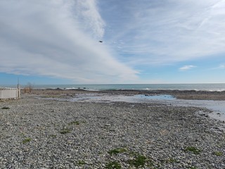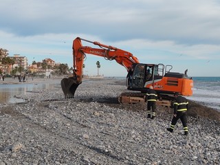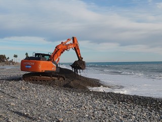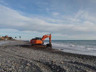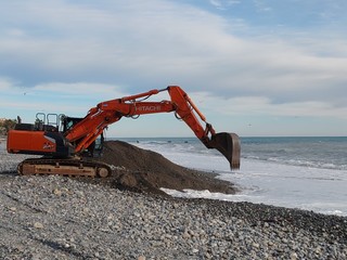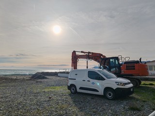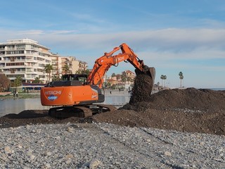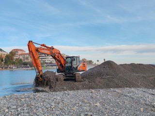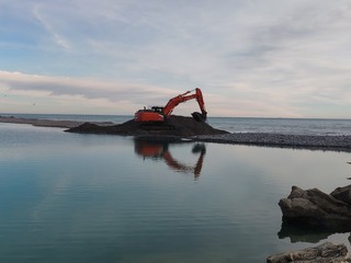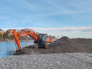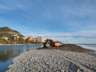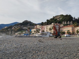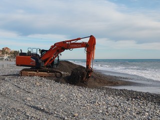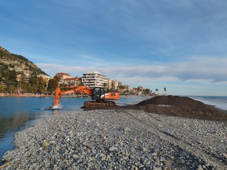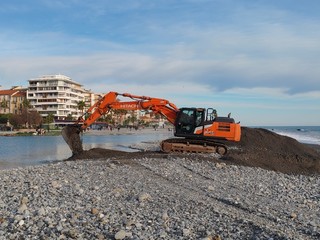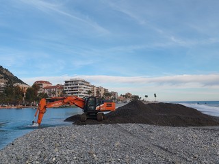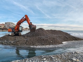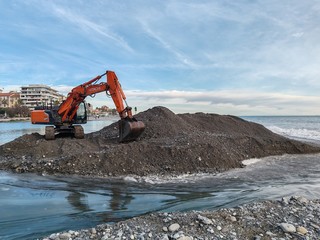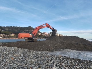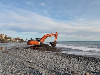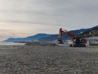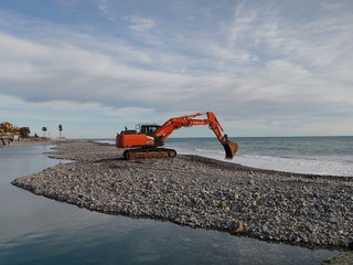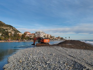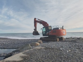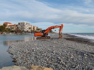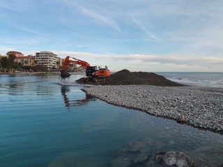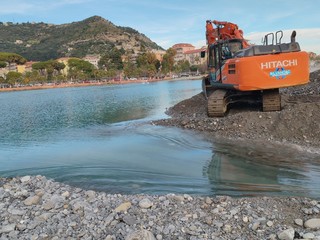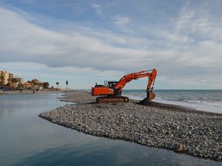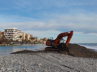 E' stato necessario l'intervento di un ruspa, giunta a Ventimiglia nel pomeriggio odierno, per liberare la foce del Roia dal muro di pietre portate dalla forte mareggiata che impedivano la corretta fuoriuscita del fiume in mare.