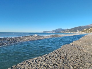Nell'area in cui solitamente il fiume esce in mare si è, infatti, innalzato il livello dell'acqua che ha così raggiunto entrambe le sponde degli argini. Un muro di sassi creato dalla potenza delle onde del mare, però, ha impedito al Roia di sfociare e così la corrente ha scavato tra le pietre creando un letto orizzontale per il fiume proprio in mezzo alla spiaggia che arriva fino davanti al Resentello, punto in cui finalmente si unisce al mare.