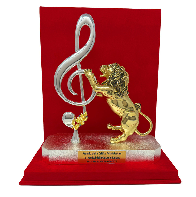 Tra i riconoscimenti più attesi spicca il Premio della Critica “Mia Martini”, istituito nel 1982 e assegnato dai giornalisti accreditati presso la Sala Stampa al brano ritenuto più meritevole. L’opera realizzata, è una scultura con bagno in oro e argento, raffigurante un leone poggiato su una chiave di violino. Alla base si evidenzia una composizione di fiori in argento, arricchita da pietre azzurre.