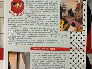 La scelta di inaugurare la sede con “Heart of Gaza” non è casuale. La mostra, composta da disegni realizzati da bambini di Gaza e accompagnata da fotografie e pannelli informativi predisposti dall’associazione, propone un percorso che ripercorre la storia della Palestina dalla creazione dello Stato di Israele fino a oggi. Al centro ci sono gli sguardi e le espressioni artistiche dei più piccoli, strumenti attraverso cui raccontare esperienze di vita segnate dal conflitto.