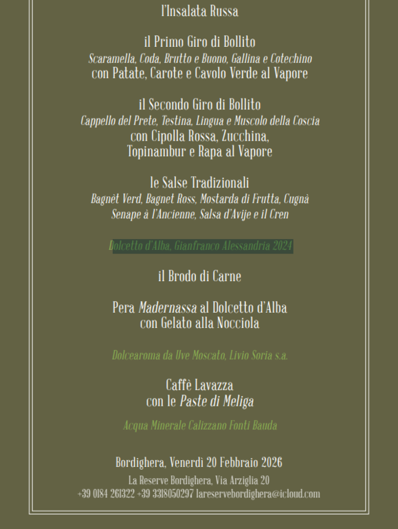 Nella location bordigotta dove il fascino del mare incontra l’alta cucina gli interessati potranno degustare, per l'occasione, l’insalata Russa, il primo giro di bollito durante il quale verranno serviti scaramella, coda, brutto e buono, gallina e cotechino con patate, carote e cavolo verde al vapore. Al secondo giro di bollito verranno, invece, serviti appello del prete, testina, lingua e muscolo della coscia con cipolla rossa, zucchina, topinambur e rapa al vapore.