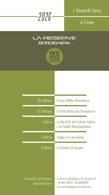 Eccellenza gastronomica e ottimi vini in un'atmosfera suggestiva. Inizieranno il 20 febbraio le serate a tema proposte nel ristorante “La Réserve”, incastonato nella scogliera di Bordighera. Il protagonista del primo appuntamento de "I venerdì sera a cena" sarà il gran bollito piemontese accompagnato dalle sue sette salse.