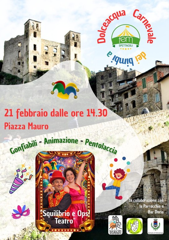 Verrà recuperato sabato 21 febbraio il Carnevale dei bambini a Dolceacqua. L'evento, che era stato spostato a causa del maltempo, verrà proposto in piazza Mauro dalle 14.30.
