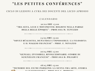 Il prossimo appuntamento è previsto per il 13 marzo con al centro la filosofia e il maggio francese. Ad aprile, il 10, si parlerà di scienziate francesi e il 18 maggio il ciclo di conferenze si chiuderà con il sogno parigino tra arte, storia e letteratura. Gli incontri sono tenuti da docenti del liceo Aprosio.