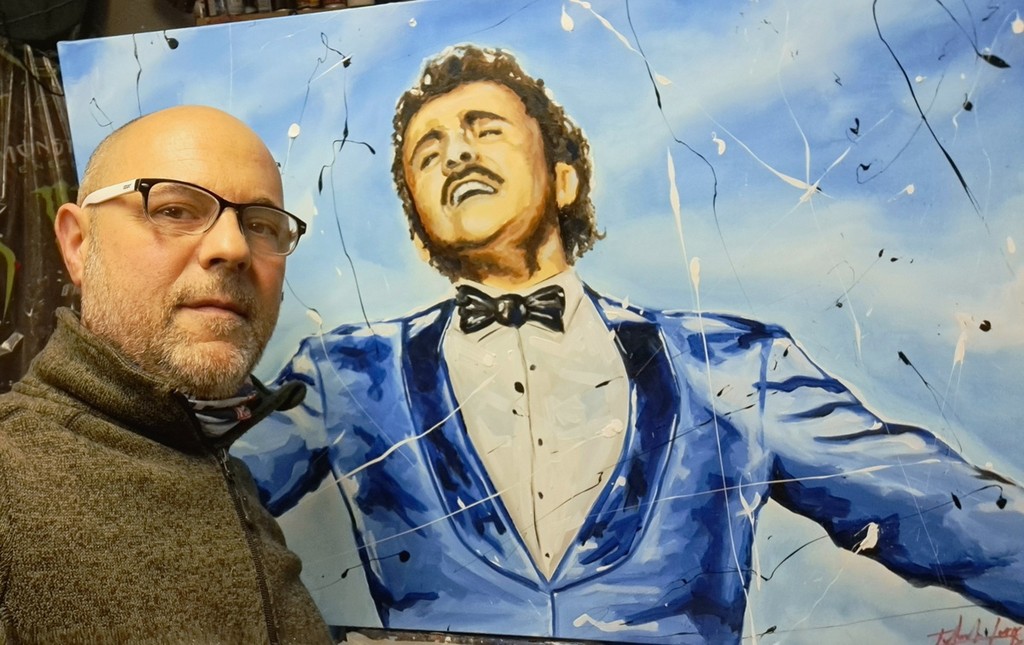 Anche quest’anno Luca Colombo, pittore di Ospedaletti, porta la sua arte al Festival di Sanremo. Per l’edizione 2026 ha scelto di rendere omaggio al cantante italiano più famoso al mondo, Domenico Modugno, con un dipinto dedicato a “Nel blu dipinto di blu”, il brano che nel 1958 trionfò al Festival e divenne un successo planetario, simbolo della musica italiana nel mondo.