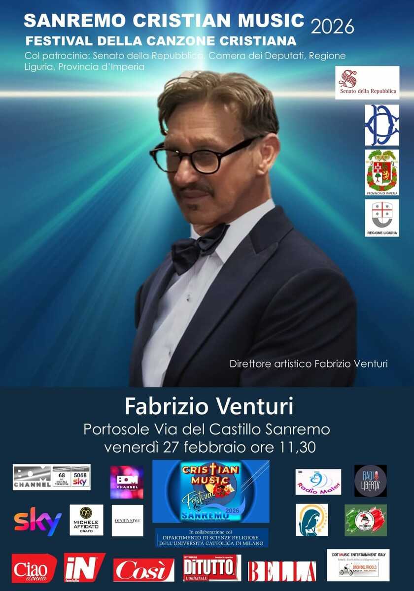 La Città dei Fiori ospita, ancora una volta, due manifestazioni musicali che dialogano e si distinguono per linguaggi e identità. Da un lato, la storica kermesse del Festival della Canzone Italiana, simbolo della tradizione pop italiana; dall’altro, il Sanremo Cristian Music Festival – Festival della Canzone Cristiana 2026, ideato e diretto dal cantautore toscano Fabrizio Venturi, conosciuti nel mondo come il Sanremo Christian Song Festival https://en.wikipedia.org/wiki/Sanremo_Christian_Song_Festival capace di trasformare la spiritualità in linguaggio artistico contemporaneo e internazionale. Questa edizione conferma il carattere internazionale del Festival della Canzone Cristiana: artisti provenienti da tutta Italia portano nuove sonorità, esperienze culturali e visioni artistiche che arricchiscono Sanremo, trasformando la Christian Music in fenomeno culturale e di spettacolo, in grado di conquistare il pubblico italiano e internazionale, e aprendo una nuova onda nella storica città dei Festival. Il Festival, che ha ricevuto il Patrocinio del Senato della Repubblica italiana, della Camera dei Deputati, della Regione Liguria e delle Provincia di Imperia, si ispira profondamente al pensiero di Sant’Agostino, il quale ricordava che “Chi canta bene prega due volte”: un motto che sintetizza perfettamente la missione del Sanremo Cristian Music Festival, capace di unire bellezza artistica, spiritualità e valori universali in un linguaggio contemporaneo e internazionale.