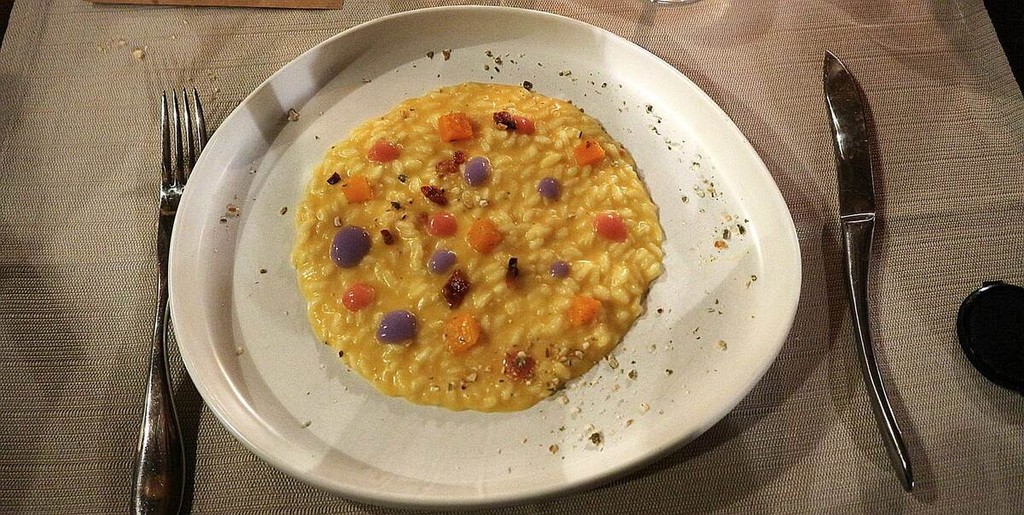Il risotto alla zucca, giocato su due consistenze e sostenuto dal contrasto sapido del guanciale, ha rappresentato il cuore tecnico della serata.
