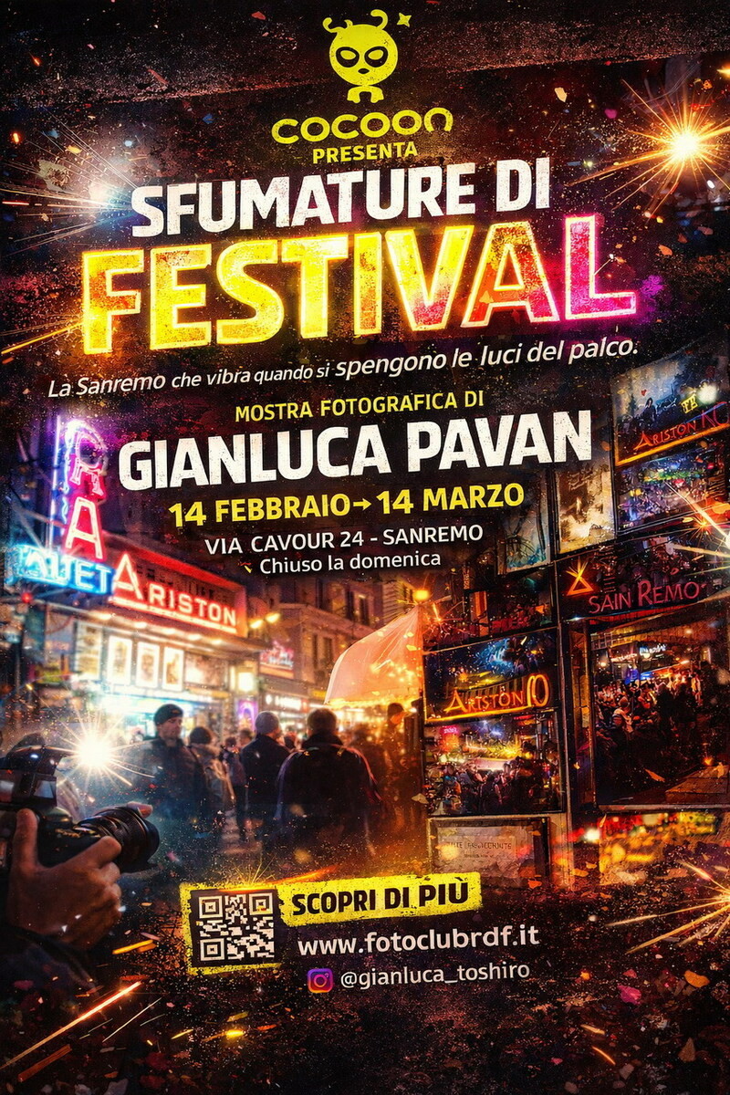 Al Cocoon, in Via Cavour, dal 14 febbraio al 14 marzo con “Sfumature di Festival”, Gianluca Pavan racconta la città quando le luci del palco si abbassano ma l’energia resta nell’aria. Le sue immagini sono fatte di colori accesi, riflessi notturni, folla in movimento, dettagli che spesso sfuggono ma che rendono il Festival un’esperienza totale. È la Sanremo che vibra fuori dall’inquadratura televisiva, quella che si respira per strada.