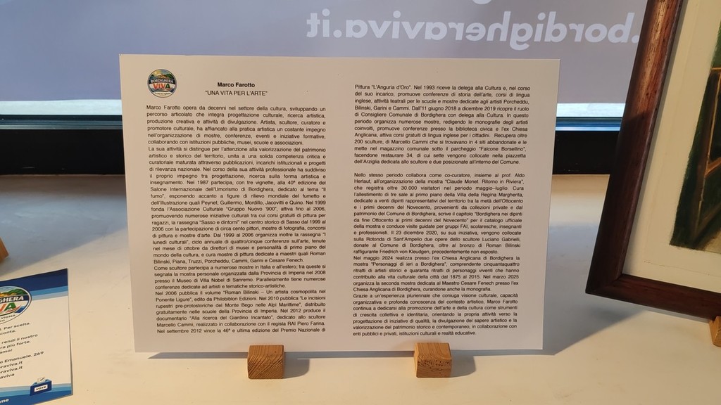 All'interno del point è possibile ammirare anche la mostra d'arte dell'artista bordigotto Marco Farotto, promotore della lista civica Bordighera Viva. "Il progetto espositivo si inserisce nel solco della tradizione artistica di Bordighera, città storicamente attenta al dialogo tra arte e territorio. Ospiteremo diversi artisti locali, il primo è Marco Farotto" - fa sapere il candidato sindaco Carlo La Vigna - "I dipinti esposti da Farotto sono un omaggio appassionato al Beodo, angolo dell’anima profondamente caro ai cittadini di Bordighera. In ogni tela le palme tornano come presenze vive, quasi custodi silenziose del paesaggio, mentre i colori, vibranti, intensi e ardenti, sprigionano un’esplosione di luce che avvolge lo sguardo, emoziona e restituisce tutta la poesia di quei luoghi amati. Iniziamo, quindi, mettendo in evidenza lo spirito del nostro gruppo: persone che, accanto all’impegno civico, portano competenze, sensibilità e percorsi professionali profondamente radicati nel territorio".