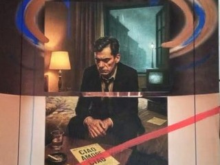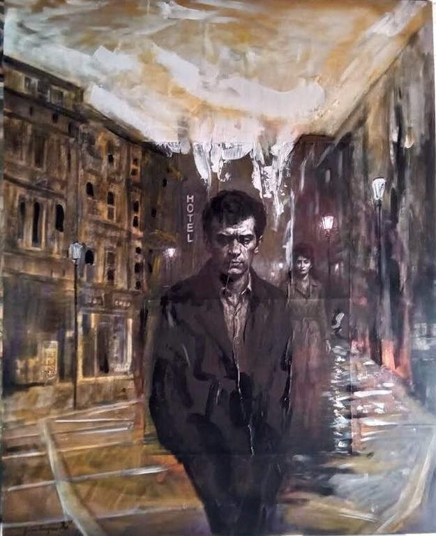 I quadro – Il marciapiede delle speranze che svaniscono Un marciapiede bagnato di pioggia, lampioni tremanti, architetture che sembrano piegarsi sotto il peso del destino. Tenco è un’assenza che cammina, un silenzio che racconta la stanchezza di chi ha sperato troppo.