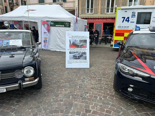 Protagonista dell’allestimento la storica Alfa Romeo Giulia Super 1.6, prodotta tra il 1962 e il 1972, 1570 di cilindrata e 90 cavalli di potenza, capace di raggiungere i 175 chilometri orari con cambio a cinque marce. Accanto a lei, la Giulia 1.6 TI, altro modello iconico che per anni ha rappresentato la mobilità operativa dell’Arma. Un confronto volutamente simbolico: la vecchia Giulia e quella nuova, il passato e il presente dell’Arma messi uno di fronte all’altro per raccontare un’unica storia.